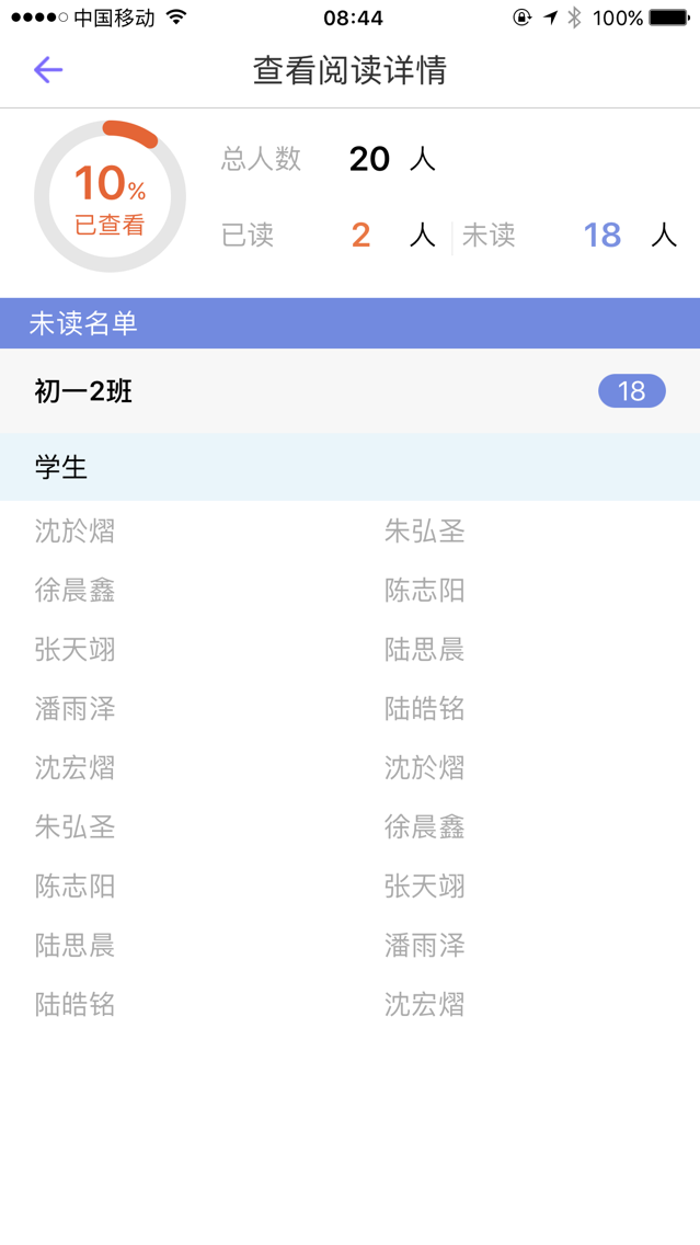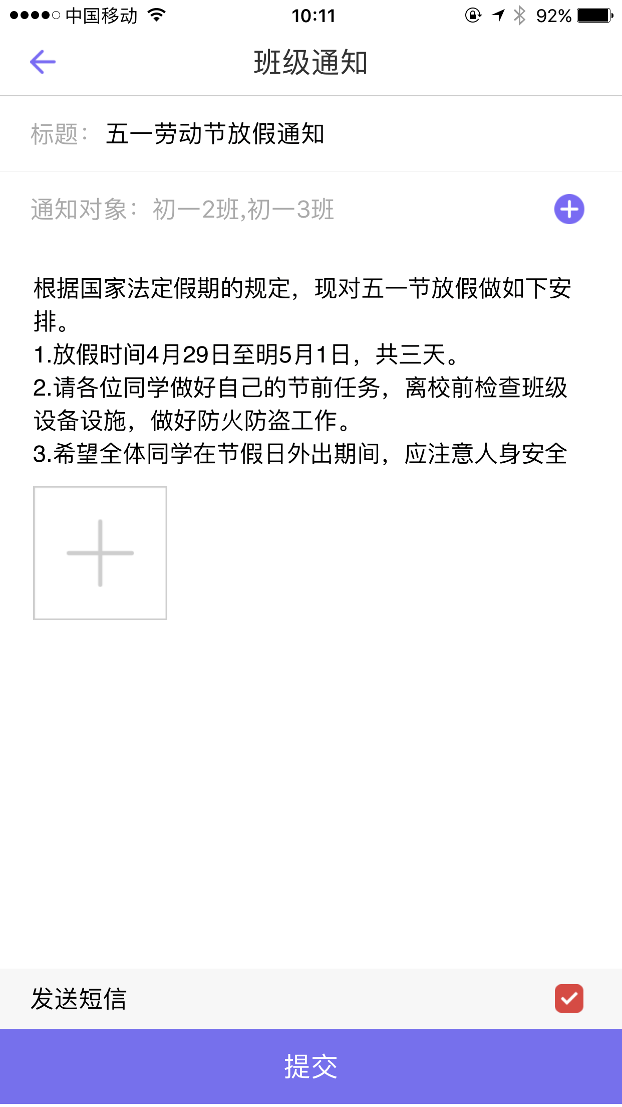 班级通知发送给班级中的所有家长成员,家长可以 第一时间收到 App 推送,替代了原先校讯通等短信功能,且内容更加详尽丰富,教师亦可查阅家长已读信息,了解送达情况。
