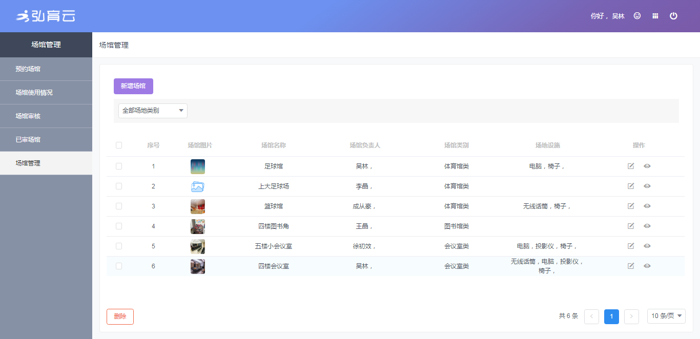 管理员可以在平台里管理、维护场所基础信息,如场馆名称、场馆负责人、场馆类别、场地设施等内容。