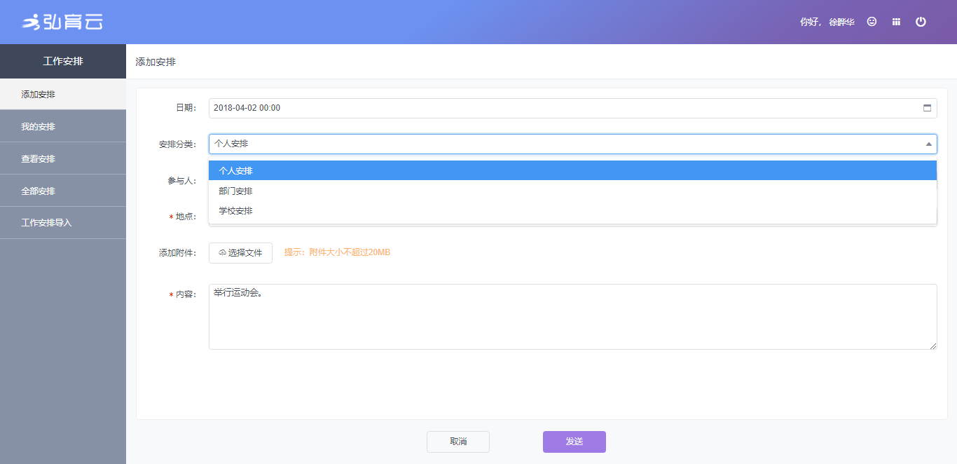 采用全日历方式显示、管理工作,可以按月、周、日制定工作,支持权限设置,人性化的管理界面,用户可以直接定位到某个时间点安排自己的工作;创建工作时,为了提醒自己及时完成,提供消息推送功能,学校工作安排完全公开,方便领导者根据员工工作安排工作,宏观把握。