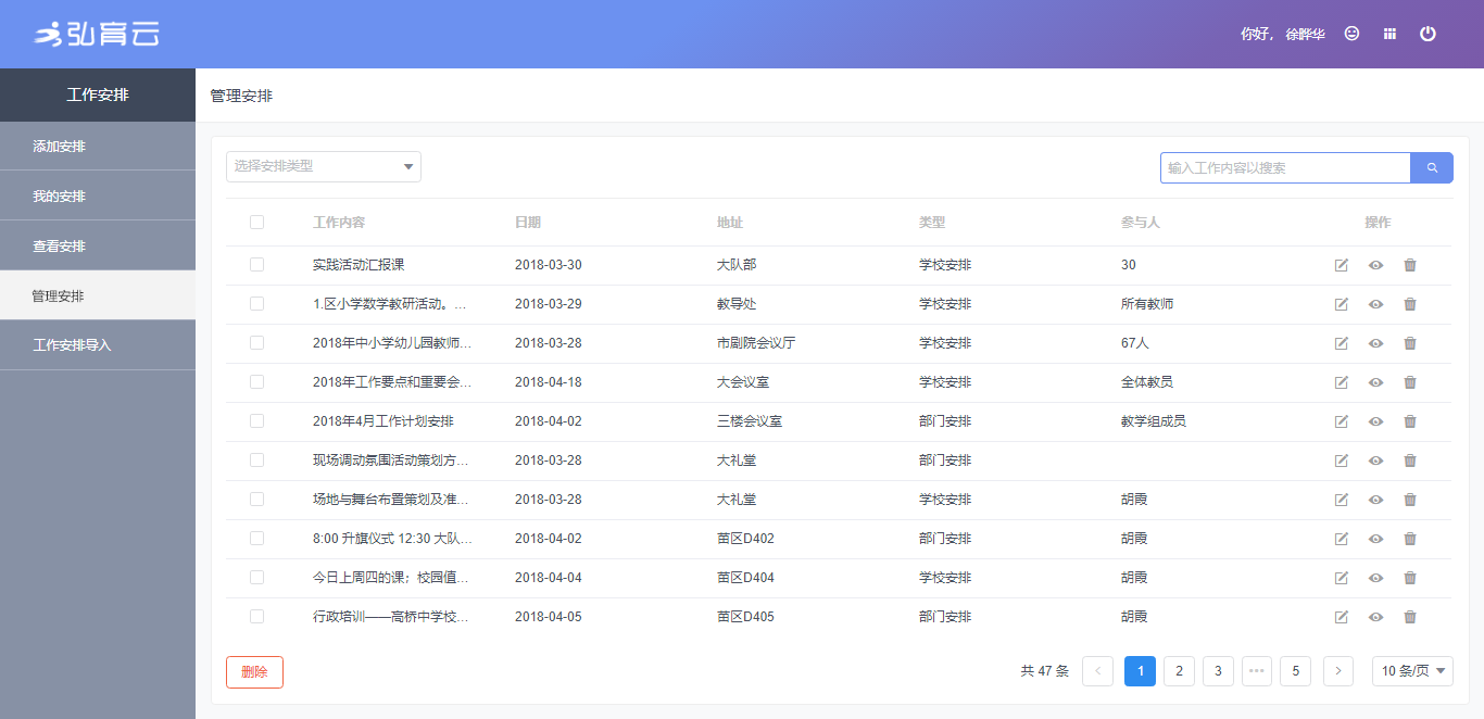 管理安排:对往期工作及以后工作的管理(查看详情、编辑、删除)。