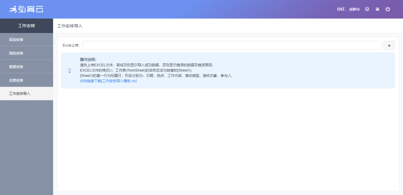 工作安排导入:按照规定的表格模板填写对应的工作安排、地点、人员、时间,一次性导入平台完成管理员工作发布任务。