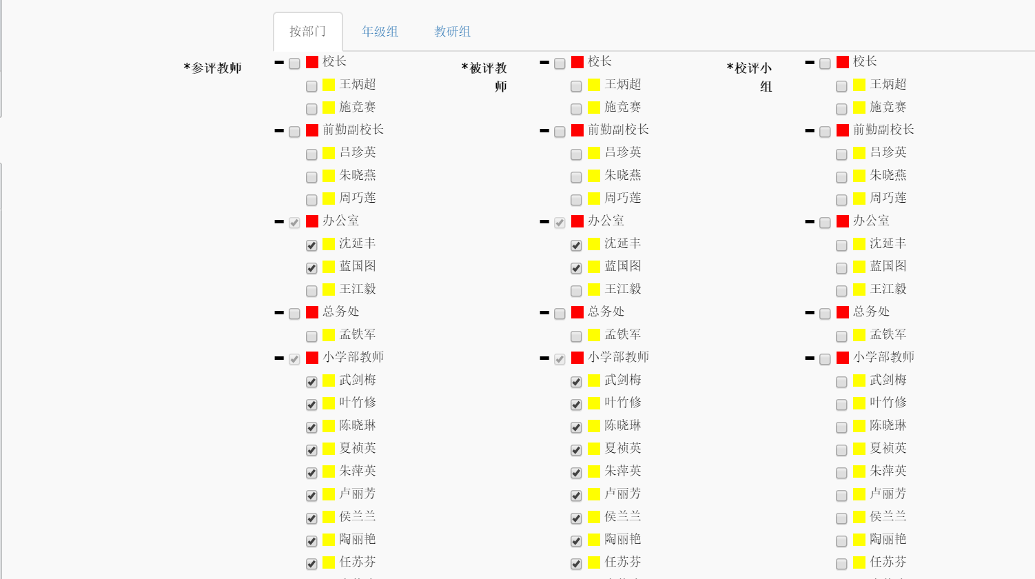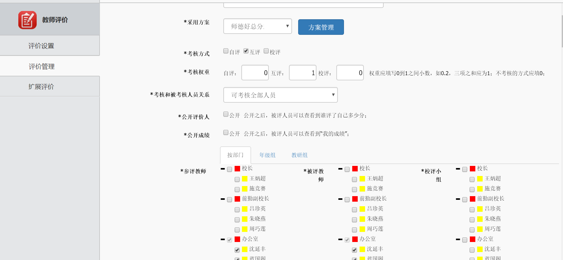包括教师分组和组内成员管理两部分。既可以把教师按照学科分组,例如语文组、数学组等等,也可以按照功能分组,例如班主任组、选修课组, 还可以按照职能部门分组,例如:校长党委组、图书馆组、总务处组、教务处组等等。 分组完成之后,需要对组内的成员进行管理,把被评价的教师分配到不同的组内接受评价。