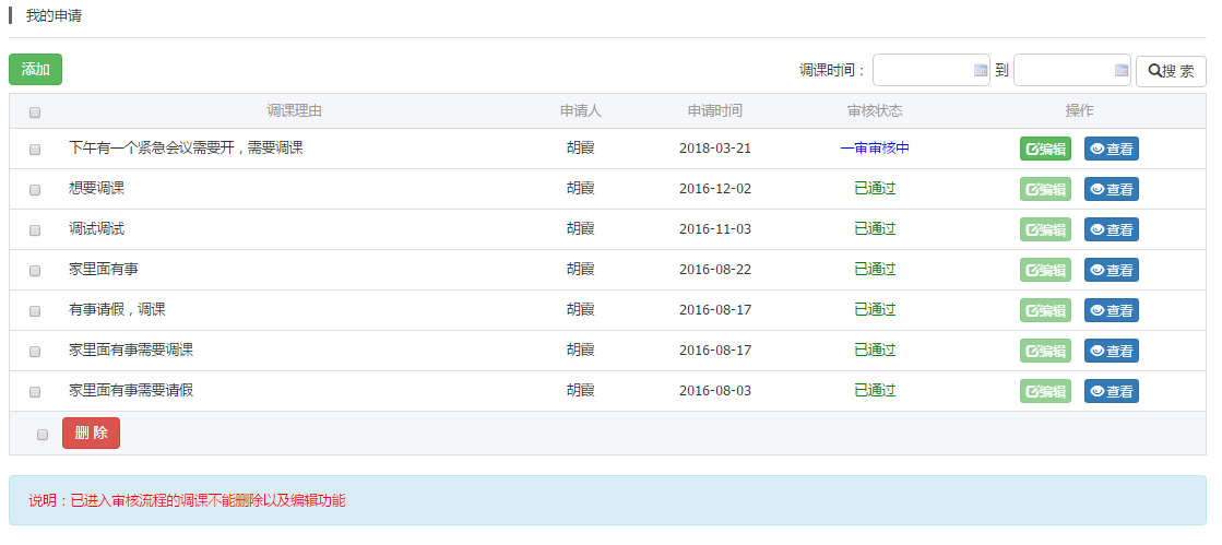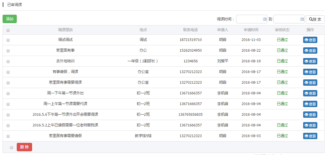 教师只需要填写调课理由、调课地点、手机号码、选择审批部门则可以进行申请调课;审核人员则会看到申请,对该调课信息进行审核。