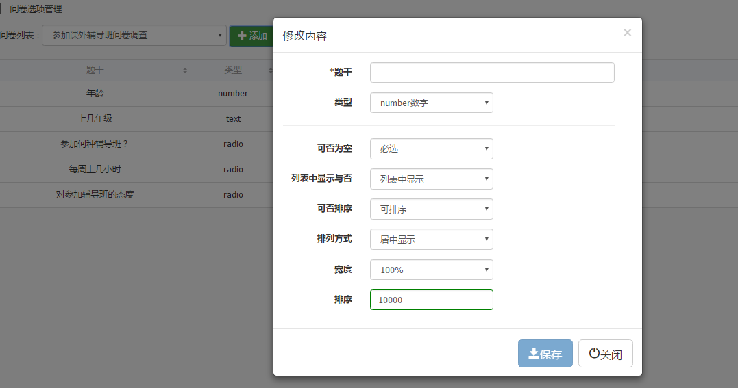 学校需要收集民意或者调查统计时,可以通过问卷调查在线实现。管理员在后台新增问卷:设置问卷基本信息、参评人员、问卷调查项;发布问卷后,即可让相关人员参与投票,收集结果。 制作问卷分为设置问卷基本信息和编辑问卷内容两项。设置问卷基本信息主要设定了问卷的名称、起止时间、参与方式、参与者等信息。