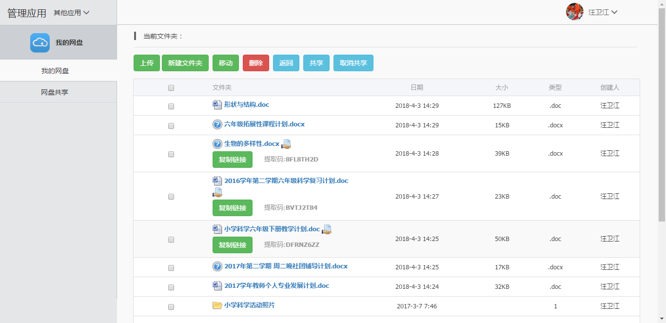 我的网盘是可以对上传的文件进行归类,首先新建文件夹,在相应文件夹里面上传文件,上传的文件,可以是私密的,也可以共享给其他教师,共享对象可以是全部教师或者是指定教师,上传的文件也可以随意移动到某一个文件夹里面共享的文件,可以直接复制链接并提供提取码,分享给其他教师。