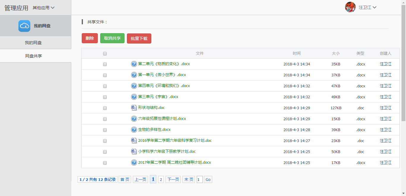 网盘共享是存储所有教师共享的文件,选择附件名称可以直接下载,如果不想查看这个文件,直接可以删除,也可以对所有共享的文件进行批量下载;如果是自己共享的文件,直接可以取消共享。