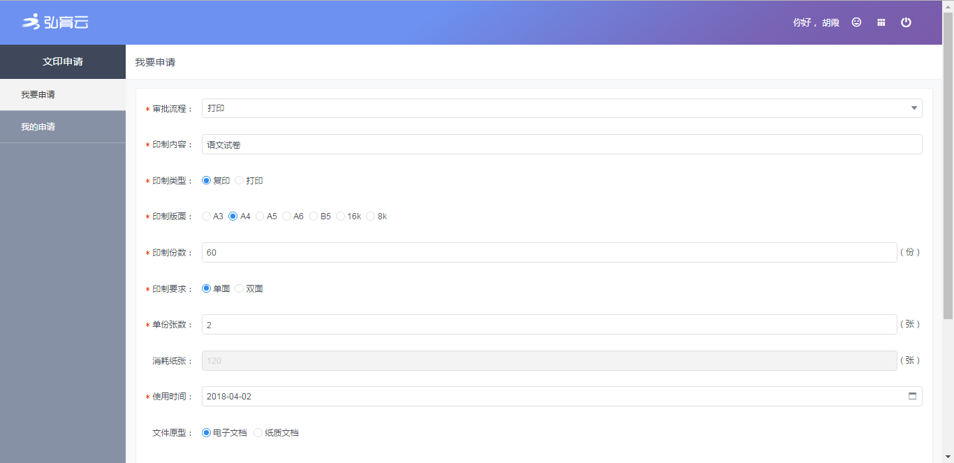对学校教师需要申请打印、复印的文件进行在线申请,教职工登录系统后可以申请打印或复印文件,审批通过之后即可使用领取。可以查看学校各个月份的使用纸张,某个教师的使用量,做到学校领导可以更加清楚学校的用纸情况。