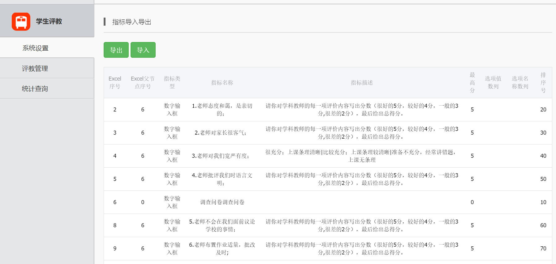 在操作过程中,为了方便学校管理员操作,可以通过导入、导出的方式,批量添加指标。