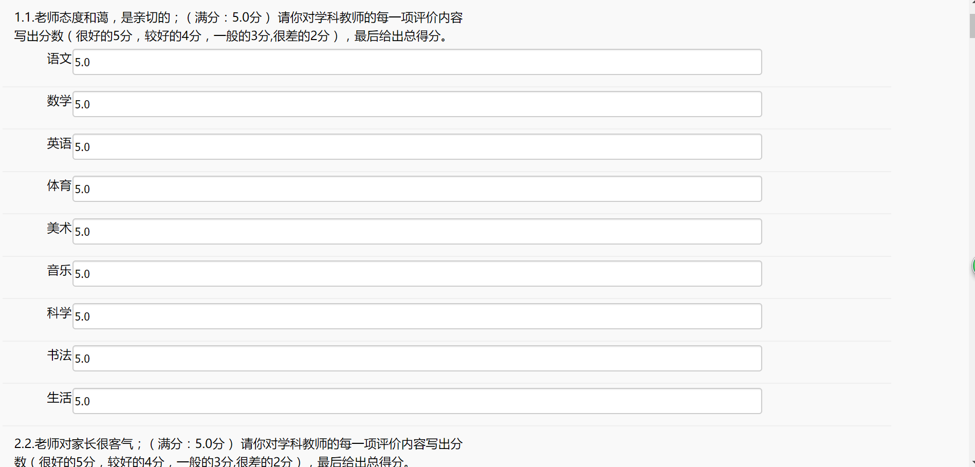 让学生对他们的所有的科任教师从指定的评价内容和评价选项作出主管上的选择,并提交他们的选择结果。 学校可以从老师教学能力,教研水平,教学方法,师德师风,课堂纪律,作业批改,学生奖惩等等各方面让学生对教师作出主观上的评价。