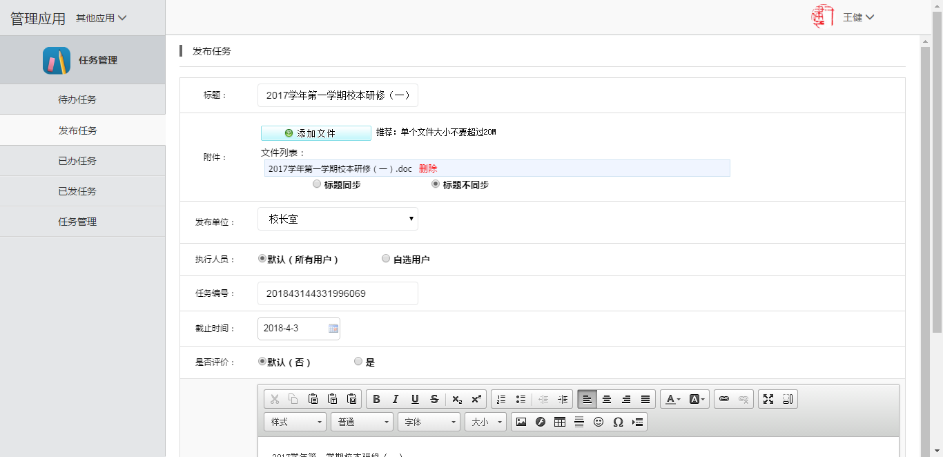 点击“发布任务”,填写任务的标题和内容,上传附件以及填写任务执行人和截止时间。