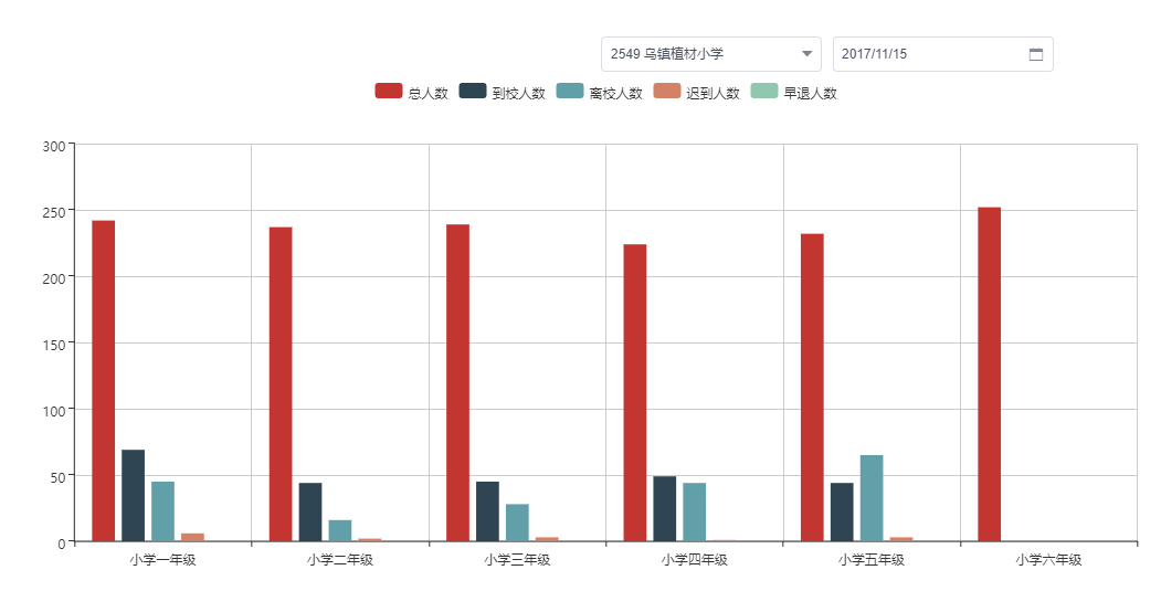 通过对日常考勤数据的分析汇聚可以获得各个年级、班级的整体情况比较,对弈异常考勤记录可以进行快速的定位。