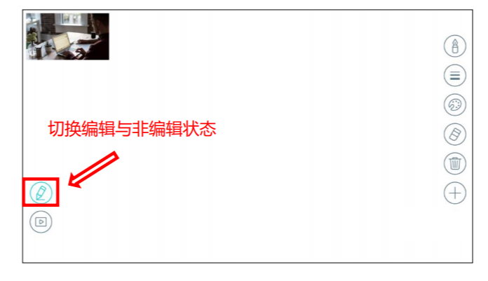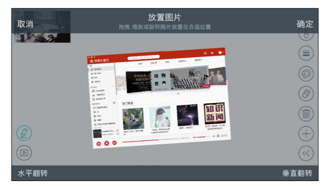 在微课录制时,右侧出现白板编辑时常用按钮。从上到下依次为笔触、粗细、颜色、橡皮、清空、添加。能自由选择笔刷的粗细颜色进行标注,在绘图和擦除、暂停和播放之间随意切换,支持旋转等图片编辑功能。在纸张上的书写轨迹将同步在APP中显示,实时预览到微课的录制效果。