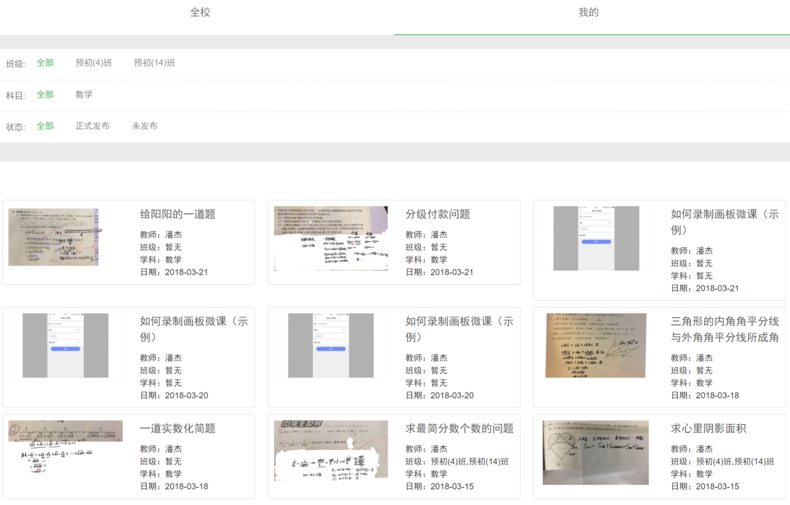 在我的微课浏览功能里,可以看到自己录制的所有的难题解析微课视频,可以按照任教班级进行归类,也可以按照任教学科、发布状态进行归类。同一微课可以发布到多个班级,也可以对已经发布的微课进行撤回。