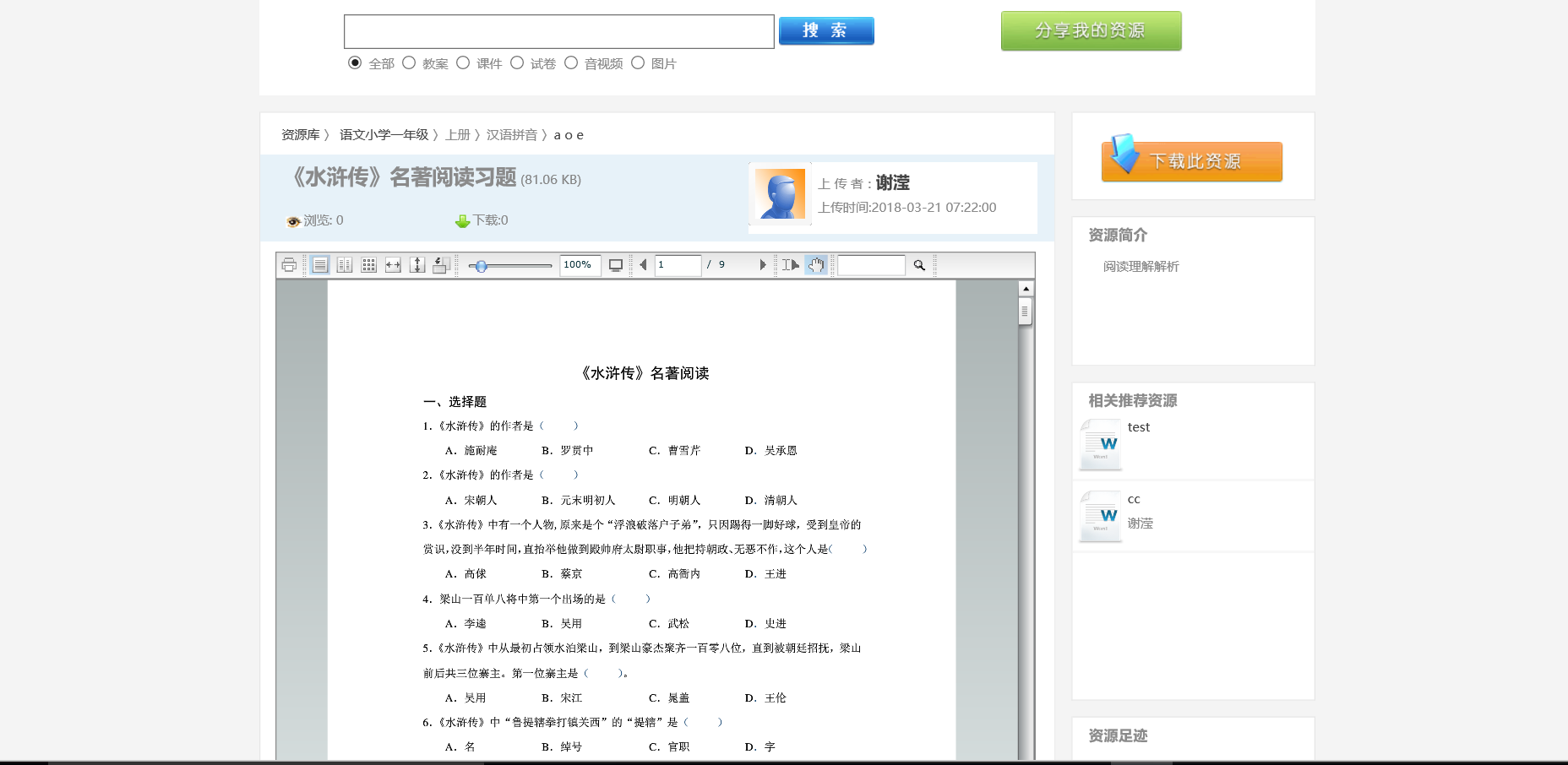 资源预览,标准的flash阅读模式,直接查看资源内容,方便老师了解。